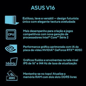 O notebook ASUS V16 turbina as experiências de criar e jogar, com design estiloso, leve e versátil. Com nova geração de processadores Intel Core Série 2 e placa de vídeo NVIDIA GeForce RTX 4050, a máquina lida tranquilamente com demandas profissionais e criativas, como design gráfico, edição de vídeo e modelagem 3D, graças à aceleração por IA. Já em jogos competitivos, o ASUS V16 garante jogabilidade fluida para aproveitar a tela envolvente de 16 polegadas e 144 Hz de taxa de atualização. Preparado para o futuro, ainda conta com slots livres de memória RAM para upgrades.