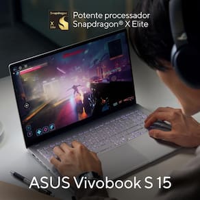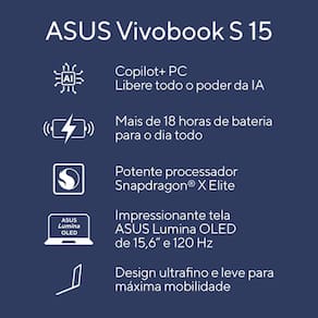 Conheça o primeiro ASUS Copilot+ PC o ASUS Vivobook S 15, um notebook elegante com tecnologia baseada em Inteligência Artificial (IA) e desenvolvido para os usuários mais exigentes. Com o desempenho eficiente do processador Qualcomm Snapdragon X Elite, desfrute de até 18 horas de produtividade contínua. O ASUS Vivobook S 15 possui tela ASUS Lumina OLED de 2.8K e 120 Hz, sistema de áudio imersivo e design sofisticado em metal. Com apenas 1,47 cm de espessura e 1,42 kg1 de peso, sua mobilidade está garantida - e sem esforço. O teclado também é um diferencial, pois apresenta iluminação RGB de zona única e uma exclusiva tecla2 dedicada Copilot para assistência instantânea com recursos de Inteligência Artificial, que irão revolucionar o modo como você trabalha, cria e se diverte. Seja bem-vindo a um futuro inovador e elegante com o ASUS Vivobook S 15, seu primeiro ASUS Copilot+ PC, e permita que a IA seja sua aliada de todo dia.