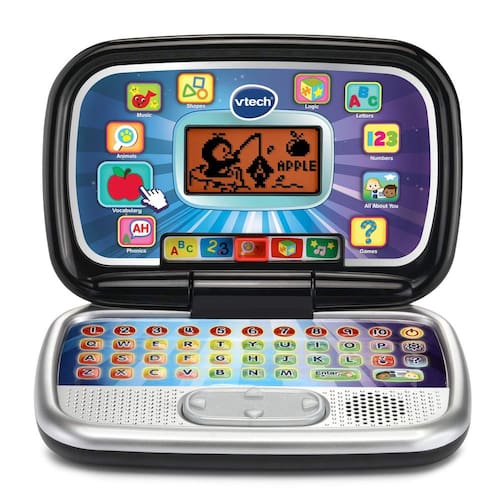Notebook pré-escolar inteligente VTech Play, preto — O laptop de brinquedo preto e elegante, como o da mamãe e do papai, tem 30 atividades de aprendizado com aprendizado nivelado. Personalize-o com o nome, a idade, o avatar de seu filho e muito mais - As atividades incluem identificar letras, sons de letras, formas e números e categorizar alimentos em frutas e vegetais - Jogue jogos de lógica, aprenda sobre sons e pegadas de animais e explore sons de instrumentos com um jogo musical - As atividades apresentam às crianças palavras, letras e números iniciantes em espanhol - Destinadas a crianças de 3 a 6 anos. Requer 2 pilhas AA. Baterias incluídas apenas para fins de demonstração. Baterias novas recomendadas para uso regular