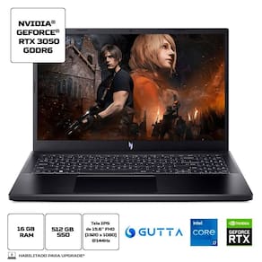 O notebook gamer acer nitro v15 anv15-51-73e9 é projetado para oferecer desempenho excepcional em jogos, criação de conteúdo e multitarefa, combinando potência e portabilidade para gamers e profissionais. Equipado com o processador intel core i7-13620h de 13 geração, 16gb de ram ddr5, 512gb ssd nvme, e placa de vídeo nvidia geforce rtx 3050 com 6gb gddr6, este notebook entrega gráficos de alta qualidade e resposta rápida em jogos modernos e aplicativos exigentes. A tela 15.6 full hd ips com taxa de atualização de 144hz proporciona imagens fluidas e vibrantes, enquanto o sistema operacional linux gutta oferece flexibilidade para personalização. Com design agressivo, teclado retroiluminado e sistema de refrigeração avançado, o nitro v15 é ideal para quem busca desempenho gamer a um preço competitivo. Características principais Processador intel core i7-13620h: 10 núcleos 6 performance + 4 eficiência , 16 threads, clock base de 2.4ghz turbo até 4.9ghz e 24mb de cache, ideal para jogos, streaming e edição de vídeo. Tela 15.6 full hd ips 144hz: resolução 1920x1080 com painel ips para cores precisas e ângulos de visão amplos; taxa de 144hz reduz tearing e melhora a fluidez em jogos. 16gb ram ddr5: memória de 4800mhz 2x8gb suporta multitarefa pesada e jogos modernos, com possibilidade de expansão verifique com o fornecedor . Armazenamento ssd 512gb: ssd m.2 nvme pcie gen 4 proporciona inicialização em segundos e carregamento rápido de jogos e aplicativos. Placa de vídeo rtx 3050 6gb gddr6: suporta ray tracing e dlss, garantindo gráficos realistas em jogos como cyberpunk 2077, fortnite e call of duty. Sistema operacional linux gutta: plataforma leve e personalizável, ideal para usuários avançados ou que desejam instalar outro so, como windows. Teclado retroiluminado: layout abnt2 com retroiluminação rgb confirme zonas com o fornecedor , ideal para uso em ambientes escuros. Refrigeração avançada: sistema de ventilação dupla com tecnologia acer coolboost mantém temperaturas baixas durante sessões intensas. Design gamer: chassi em preto obsidian black com detalhes agressivos, peso de 2.1kg e espessura de 26.9mm, equilibrando portabilidade e robustez. Conectividade completa: wi-fi 6, bluetooth 5.2, portas usb 3.2, usb-c, hdmi 2.1, ethernet gigabit, e entrada para fone/microfone. Especificações técnicas Modelo: acer nitro v15 anv15-51-73e9 nh.Qqdbl.002 . Processador: intel core i7-13620h 13 geração, 10 núcleos, 16 threads, 2.4ghz base, até 4.9ghz turbo, 24mb cache . Memória ram: 16gb ddr5 4800mhz 2x8gb, expansível até 32gb, confirme com o fornecedor . Armazenamento: 512gb ssd m.2 nvme pcie gen 4 suporta expansão com slot adicional, confirme com o fornecedor . Tela: 15.6 full hd 1920x1080 , painel ips, 144hz, brilho de 250 nits. Placa de vídeo: nvidia geforce rtx 3050 6gb gddr6 tgp até 95w, confirme com o fornecedor . Sistema operacional: linux gutta 64 bits . Conexões: 1x usb-c 3.2 gen 2 com thunderbolt 4, confirme com o fornecedor , 3x usb 3.2 gen 1, 1x hdmi 2.1, 1x ethernet rj-45, 1x conector fone/microfone 3.5mm. Conectividade: wi-fi 6 802.11ax , bluetooth 5.2. Teclado: abnt2 com teclado numérico e retroiluminação rgb confirme zonas com o fornecedor . Webcam: hd 720p com microfone duplo. Áudio: 2 alto-falantes estéreo com dts:x ultra. Bateria: 57wh, até 6 horas de autonomia varia conforme uso . Carregador: 135w conector cilíndrico . Material: policarbonato reforçado, acabamento em obsidian black. Dimensões: 360.1 x 239.9 x 26.9 mm. Peso: aproximadamente 2.1kg. Aplicações Gaming: executa jogos aaa com gráficos médios a altos ex.: valorant, gta v, apex legends e suporta ray tracing para maior realismo. Criação de conteúdo: ideal para edição de vídeos, fotos e modelagem 3d em softwares como adobe premiere, e blender. Streaming: suporta transmissões em plataformas como twitch, com desempenho estável para jogos e captura. Homologação Anatel: 079902113999