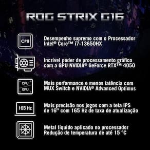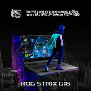 O novo ROG Strix G16 traz a 13a geração de processadores Intel Core i7-13650HX, que garante o desempenho supremo que você precisa para elevar sua gameplay e carregar seu time em quaisquer desafios, graças aos seus 6 núcleos de performance e 8 núcleos de eficiência. E com modernos recursos como o novo DLSS 3, que aumenta o FPS dos jogos, o ROG Strix G16 é capaz de trazer uma experiência ainda mais imersiva e realista.
