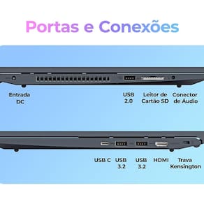 - Portas: 1 HDMI, 2 USB 3.2, 1 USB 2.0, 1 USB C, Conector de áudio P3; Trava Kensington;