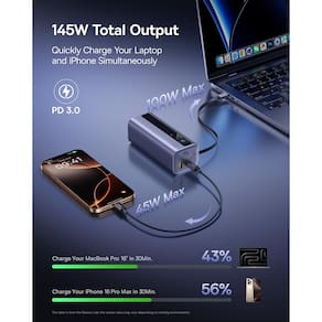 - Carregamento ultrarrápido de 145 W?Ligue seus dispositivos em velocidades incríveis com três portas USB-C de 100 W! Carrega um MacBook Pro de 16 polegadas a 43% em apenas 30 minutos. A saída de porta dupla proporciona uma combinação de 145 W, perfeita para carregar simultaneamente laptops, tablets e telefones.