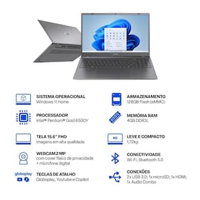 Marca: Multi Modelo: UB365 Tela: 15.6 FHD Cor: Cinza Sistema Operacional: Windows 11 Home Processador: Intel Pentium Gold 6500Y -4 MB de cache, ate 3,40 GHz- Armazenamento interno: 128 GB Flash -eMMC- -expansivel via slot M.2 2280 com suporte a NVMe 3.0 e SATA 3.0- Memoria RAM: 4GB DDR3L Camera: 2MP com cover fisico de privacidade + 2 microfones direcionais Conexao Wireless: Wi-Fi 802.11ac + Bluetooth 5.0 Portas: 2x USB 3.0; 1x HDMI; 1x conector de audio tipo Combo e 1x leitor de cartao microSD Audio: Amplificado de Alta Definicao -HD- Bateria: 7.6V 4000mAh Dimensoes: 357,4 x 233,8 x 21,3 mm Peso: 1,72 kg Certificado Anatel: 15777-22-03111 Conteudo da embalagem: Notebook Ultra, fonte de alimentacao e guia rapido Garantia: 1 ano e acessorios 3 meses