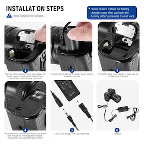 contínua?Este kit de bateria fictício pode alimentar continuamente seu Câmera Canon que usa baterias LP-E6, LP-E6N ou LP-E6NH e elimina a necessidade de substituição da bateria, perfeita para fotografia de estúdio e interior, vlogs, transmissão ao vivo e produção de filmes