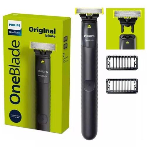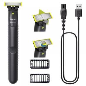 Novo aparador de pelos philips oneblade qp1424/10 cor cinza-cinza e verde-limão bivolt 110/220v - aparador e raspador philips oneblade qp1424/10 com 2 pentes, à prova dágua - bivolt