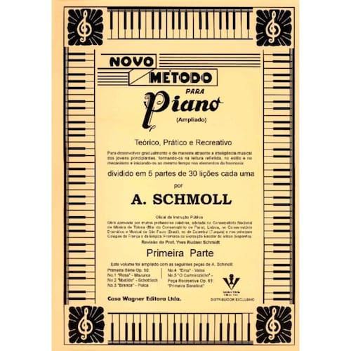 Tradicional método para piano dividido em cinco partes, tendo como proposta o desenvolvimento gradual e eficiente da inteligência musical de principiantes, formando-os na leitura refletida, no estilo e nos elementos da harmonia. Esta primeira parte comporta, além das 30 lições do método, as seguintes peças: Rosa (mazurca), Matilde (schottisch), Branca (polca), Ema (valsa), O carteirozinho e Primeira sonatina. Marca: IRMAOS VITALE EDITORES