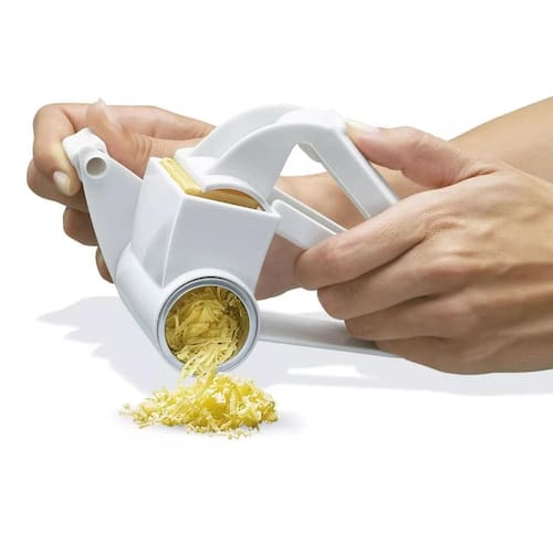 Funcionamento: o ralador manual funciona de maneira bem simples: basta que acondicione o queijo em seu interior vide figura , segure o cabo o pressionando levemente e gire a manivela. Pronto, o alimento queijo, presunto e afins sairá ralado e pronto para ser utilizado pela parte inferior do ralador. Anatômico e prático, o ralador pode ser utilizado por pessoas de qualquer idade. Além disso, a lâmina interna é em aço inox, o que confere mais qualidade e durabilidade ao produto. A lâmina também pode ser retirada, o que a torna mais simples o processo de limpeza. Mais características do produto: Material: Plástico e aço inox; Cores: Branca; Resistente e durável; Aumenta a velocidade e segurança em sua cozinha; Ean: 7899755657668