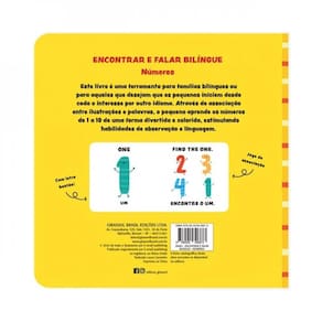 Este livro é uma ferramenta para famílias bilíngues ou para aqueles que desejam que os pequenos iniciem desde cedo o interesse por outro idioma. Através de um divertido jogo de associação entre palavras e ilustrações, o pequeno se diverte enquanto aprende os números de 1 a 10 de uma forma divertida e colorida, estimulando habilidades de observação e linguagem.