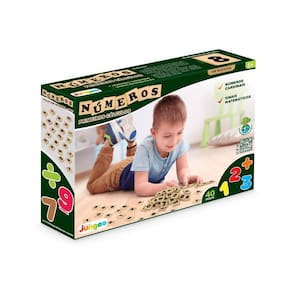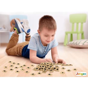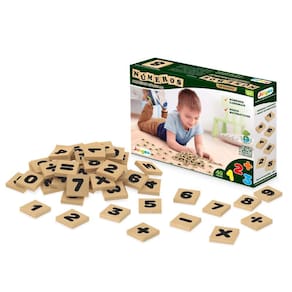Números da Junges com 40 peças em madeira de reflorestamento MDF 6mm, tamanho de 3x3cm impressas em serigrafia, com números e sinais matemáticos tabuada completa .