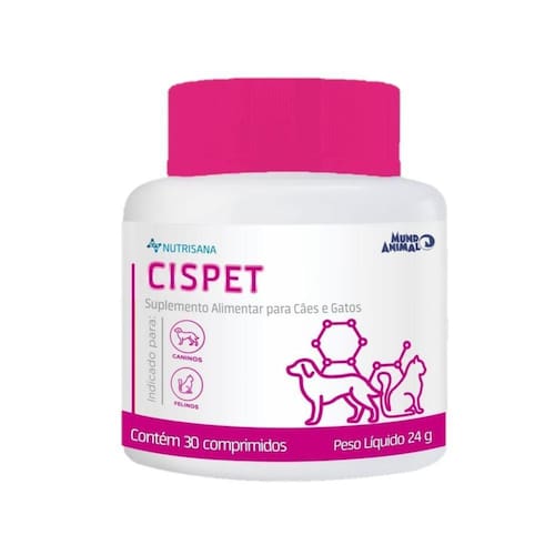 Nutrisana Cispet é um suplemento alimentar de uso oral indicado para cães e gatos contém extrato de arando (cranberry), betaglucanas e zinco. Indicado para animais em qualquer fase da vida.Modo de usar: administrar por via oral nas seguintes doses ou a critério do medico veterinario: 1/4 do comprimido para 2,5kg, 1/2 comprimido para 5kg, 1 comprimido para 10kg, 2 comprimidos para 20kg. Composição Básica do produto: extrato de aranto ( vaccitium vitis-idaea) parede celular de levedura, zinco, estearato de magnesio, dióxido de silicio (silica), polivinilpirrolidona, carboximetilcelulose sódica, aroma de peixe e lactose.