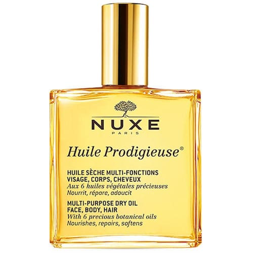 Óleo multifuncional para rosto, corpo e cabelo. Nuxe Huile Prodigieuse nutre, repara e suaviza fios e pele. De fórmula leve e não gordurosa, é rapidamente absorvido.