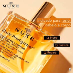 O Óleo Multifuncional Nuxe Huile Prodigieuse possui 98,1% de ingredientes naturais e 6 tipos de óleos vegetais combinados com vitamina. Isso torna a pele do rosto e do corpo macia e aveludada, e o cabelo macio, brilhante e mais flexível. Não possui conservantes.