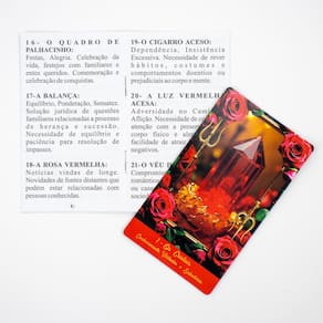 O autêntico Tarô da Pomba Gira Plas+Manual, possui as 36 cartas plastificadas e com material bem resistente que não amassa, além de ser firme facilitando o manuseio durante a sua leitura. Possui cores vivas, desenhos exclusivos e um brilho incomparável. Acompanha um manual super detalhado e com as informações necessárias para te auxiliar a fazer um bom jogo!