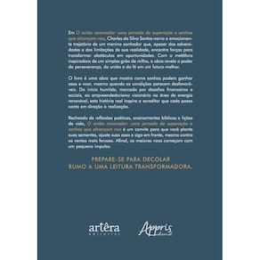 Recheado de reflexões poéticas, ensinamentos bíblicos e lições de vida, O avião renovador: uma jornada de superação e sonhos que alcançam voo é um convite para que você plante suas sementes, ajuste suas asas e siga em frente, mesmo contra os ventos mais ferozes. Afinal, os maiores voos começam com um pequeno impulso.
