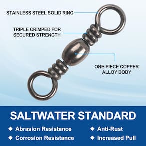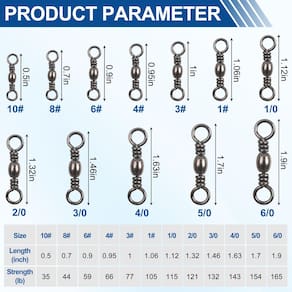 Tamanho---teste---------- Comprimento, como segue: 1#-----teste: 47,6 kg -- Comprimento: 2,7 cm 3#-----teste: 35 kg --- Comprimento: 2,5 cm 4 #-----teste: 29,9 kg --- Comprimento: 2,4 cm 6 #-----teste: 26,8 kg --- Comprimento: 2,2 cm 8#-----teste: 20 kg --- Comprimento: 1,8 cm 10 #-----teste: 16 kg --- Comprimento: 1,2 cm 1/0 ---- teste: 52 kg -- Comprimento: 2,8 cm 2/0 ---- teste: 55 kg -- Comprimento: 3,4 cm 3/0 ---- teste: 60 kg -- Comprimento: 3,6 cm 4/0 ---- teste: 65 kg -- Comprimento: 4 cm 5/0 ---- teste: 69,9 kg -- Comprimento: 4,2 cm 6/0 ---- teste: 75 kg -- Comprimento: 4,8 cm - Alta qualidade: cilindro giratório feito de cobre sólido e aço inoxidável com revestimento de níquel preto, durável e forte - Sem torção: o cilindro giratório permite uma rotação suave; mantém a torção ao mínimo - Aplicação: ótimo para vários equipamentos e líderes. Alto desempenho em pesca de robalo, ideal para pesca em água doce e salgada - Variedade de opções: vários tamanhos para diferentes situações. Tamanho: 10#,8#,6#,4#,3#,1#,1/0,2/0,3/0,4/0,5/0,6/0. Força de teste de 16 a 75 kg - Pacote: 50 peças/100 peças por pacote cilindro giratório