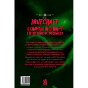 Escrito em 1926 e publicado pela primeira vez na revista Weird Tales, 1928, um dos mais aclamados contos de Lovecraft, O Chamado de Cthulhu narra a história de uma investigação sombria que traz à tona documentos aterrorizantes sobre uma criatura cósmica que ameaça a sanidade e a vida daqueles que sabem de sua existência. Este volume proporciona uma viagem às profundezas mais obscuras da mente lovecraftiana com uma seleção de contos imperdíveis e absolutamente melhores do que qualquer filme de horror.