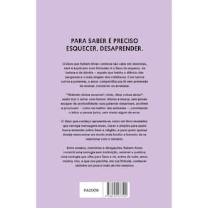 PARA SABER É PRECISO ESQUECER, DESAPRENDER. O Deus que Rubem Alves conhece não cabe em doutrinas, nem é explicado com fórmulas: é o Deus do espanto, da beleza e da dúvida – aquele que habita o silêncio das perguntas e o mais singelo dos cotidianos. Com textos curtos e potentes, o autor compartilha sua fé sem pretensão de ensinar, converter ou arrebatar. “Ridendo dicere severum: rindo, dizer coisas sérias”: assim traz o autor, com humor, lirismo e leveza, sem jamais escapar da profundidade; suas palavras desarmam, acolhem e provocam – como na melhor das amizades –, convidando o leitor a pensar junto, sem medo algum de errar. O Deus que conheço apresenta-se como um livro revelador, que carrega mensagens leves, claras e simples para quem busca entender sobre Deus e religião, e para quem apenas deseja reencontrar um modo mais bonito e honesto de se relacionar com o mistério. Entre ensaios, memórias e divagações, Rubem Alves constrói uma teologia sem instituição, sensível e poética; uma teologia que olha para Deus e vê, acima de tudo, amor, música, riso, e que nos permite, em sua finitude, conhecer também um pouco mais de nós mesmos.