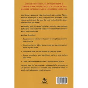 Um livro essencial para decodificar o comportamento humano, escrito por um dos maiores especialistas em linguagem corporal. Joe Navarro passou a vida observando as pessoas. Agente especial do FBI por 25 anos, ele interrogou espiões e criminosos, aprimorando dia após dia seus conhecimentos sobre comunicação não verbal. Verdadeiro ?guia de campo?, este livro sintetiza o aprendizado de Navarro em mais de 400 verbetes claros e muitas vezes surpreendentes. Da cabeça aos pés, o autor revela o significado de muitos comportamentos subconscientes. Você vai descobrir: ? O que mexer no cabelo revela sobre as emoções que queremos disfarçar ? O movimento dos lábios que entrega que estamos escondendo alguma coisa ? Os tipos de olhar e o que deduzir de cada um deles ? Gestos e posturas cujo significado varia de uma cultura para outra ? Como até nossos pés mostram o que tentamos ocultar. Um guia para ?ler? as pessoas ? seja seu chefe, um amigo ou um parceiro amoroso ? e também para aprender a emitir os sinais certos em cada situação.