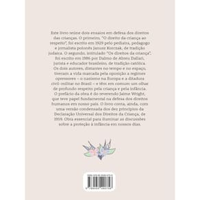 Este livro reúne dois ensaios em defesa dos direitos das crianças. O primeiro, “O direito da criança ao respeito”, foi escrito em 1929 pelo pediatra, pedagogo e jornalista polonês Janusz Korczak, de tradição judaica. O segundo, intitulado “Os direitos da criança”, foi escrito em 1986 por Dalmo de Abreu Dallari, jurista e educador brasileiro, de tradição católica. Os dois autores, distantes no tempo e no espaço, tiveram a vida marcada pela oposição a regimes opressores – o nazismo na Europa e a ditadura civil-militar no Brasil – e têm em comum um olhar de profundo respeito pela criança e pela infância. O prefácio da obra é do reverendo Jaime Wright, que teve papel fundamental na defesa dos direitos humanos em nosso país. O livro conta, ainda, com uma versão condensada dos dez princípios da Declaração Universal dos Direitos da Criança, de 1959. Obra essencial para iluminar as discussões sobre a proteção à infância em nossos dias.