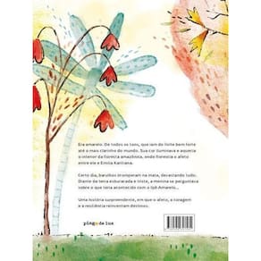 Havia em mim uma urgência de falar sobre a floresta amazônica e, mineira de coração, tratei de prosear com pessoas que conhecem a floresta, que são meio "árvores" de coração. Assim, a imagem do ipê-amarelo surgiu iluminando caminhos e possibilidades. Pesquisei sobre essa espécie tão solar e conheci o curioso caso ocorrido em Porto Velho, município de Rondônia, de um ipê que, transformado em poste de luz, havia florido novamente, para espanto dos moradores. A força e a resiliência daquela árvore - determinada em não aceitar o que o destino a impôs - são o cerne dessa história e sua parte real. Descobri também que próximo a Porto Velho fica a região dos Karitiana, um dos muitos grupos indígenas do estado de Rondônia, no sudoeste da Amazônia brasileira. Hoje, cerca de 450 pessoas estão distribuídas em sete aldeias, mas este povo já chegou a ser considerado extinto, em 1957, devido ao declínio preocupante de sua população. No entanto, conseguiram reverter tal situação com extrema resiliência e, assim como o Ipê desta história, mudaram o curso de seu destino. Diante de fontes tão preciosas, criei uma amizade ficcional entre uma menina indígena, Emilia - um dos nomes dados a crianças pela etnia Karitiana -, e um ipê-amarelo. Compartilhar esta história singular, quase mágica, é para mim a possibilidade de dar voz aos seres da floresta, e iluminar forte como um poste a potência da Amazônia e a urgência de se cuidar de toda vida que ela abriga.