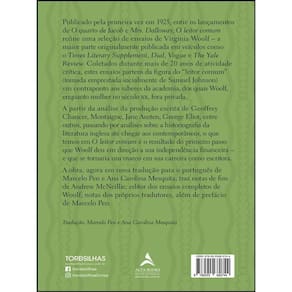 Publicado pela primeira vez em 1925, entre os lançamentos de O quarto de Jacob e Mrs. Dalloway , O leitor comum reúne uma seleção de ensaios de Virginia Woolf – a maior parte originalmente publicada em veículos como o Times Literary Supplement, Dial, Vogue e The Yale Review. Coletados durante mais de 20 anos de atividade crítica, estes ensaios partem da figura do “leitor comum” (tomada emprestada incialmente de Samuel Johnson) em contraponto aos saberes da academia, dos quais Woolf, enquanto mulher no século XX, fora privada. A partir da análise da produção escrita de Geoffrey Chaucer, Montaigne, Jane Austen, George Eliot, entre outros, passando por análises sobre a historiografia da literatura inglesa até chegar aos contemporâneos, o que temos em O leitor comum é o resultado do primeiro passo que Woolf deu em direção a sua independência financeira – e que se tornaria um marco em sua carreira como escritora. A obra, agora em nova tradução para o português de Marcelo Pen e Ana Carolina Mesquita, traz notas de fim de Andrew McNeillie, editor dos ensaios completos de Woolf, notas dos próprios tradutores, além de prefácio de Marcelo Pen.