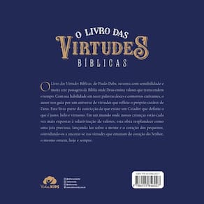 O Livro das Virtudes Bíblicas, de Paulo Debs, reconta com sensibilidade e muita arte passagens da Bíblia onde Deus ensina valores que transcendem o tempo. Com sua habilidade em tecer palavras doces e contornos cativantes, o autor nos guia por um universo de virtudes que reflete o próprio caráter de Deus. Este livro parte da convicção de que existe um Criador que definiu o que é justo, belo e virtuoso. Em um mundo onde nossas crianças estão cada vez mais expostas à relativização de valores, esta obra resplandece como uma joia preciosa, lançando luz sobre a mente e o coração dos pequenos, convidando-os a ancorar-se nas virtudes que emanam do coração do Senhor, o mesmo ontem, hoje e sempre.