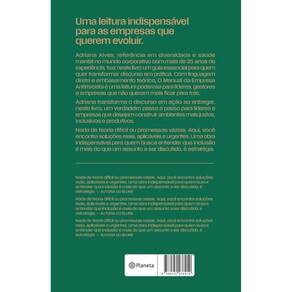 Uma leitura indispensável para as empresas que querem evoluir. Adriana Alves, referência em diversidade e saúde mental no mundo corporativo com mais de 25 anos de experiência, traz neste livro um guia essencial para quem quer transformar discurso em prática. Com linguagem direta e embasamento teórico, O Manual da Empresa Antirracista é uma leitura poderosa para líderes, gestores e empresas que não querem mais ficar para trás. A autora transforma o discurso em ação ao entregar, neste livro, um verdadeiro passo a passo para líderes e empresas que desejam construir ambientes mais justos, inclusivos e produtivos. Nada de teoria difícil ou promessas vazias. Aqui, você encontra soluções reais, aplicáveis e urgentes. Uma obra indispensável para quem busca entender que inclusão é mais do que um assunto a ser discutido, é estratégia.