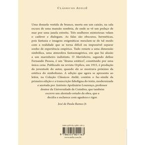 “Uma donzela vestida de branco, morta em um caixão, na sala escura de uma mansão sombria, de onde se vê um pedaço de mar por uma janela estreita. Três mulheres misteriosas velam o cadáver e dialogam. As falas são obscuras, herméticas, pois fantasia e imagens enigmáticas mesclam-se de tal modo com a realidade que se torna difícil ou impossível separar sonho de experiência empírica. Tudo remete a uma dimensão simbólica, uma atmosfera fantasmagórica, em que há alusão a um marinheiro indistinto. O Marinheiro, segundo define Fernando Pessoa, é um “drama estático”, constituído por uma única cena. Publicado na revista Orpheu, em 1915, é produção da juventude do autor, quando ele se mostrava próximo da estética do Simbolismo. A edição que agora se apresenta ao leitor, na Coleção Clássicos Ateliê, contém o fac-símile da primeira edição e a transcrição fidedigna do texto, modernizada e anotada por António Apolinário Lourenço, professor doutor da Universidade de Coimbra, que também escreve um alentado estudo da obra, que a decifra e esclarece com agudeza e rigor. [José de Paula Ramos Jr.] Edição: António Apolinário Lourenço