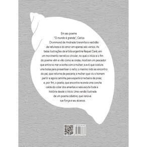 Um belo poema ilustrado sobre o amor e toda sua imensidão — um presente perfeito para casais apaixonados e apaixonados por poesia. Em seu poema “O mundo é grande”, Carlos Drummond de Andrade transmite a vastidão da natureza e do amor em apenas seis versos. As belas ilustrações da artista argentina Raquel Cané, em um movimento narrativo circular, no qual o início e o fim do poema vêm e vão como as ondas, mostram: um pescador que entra no mar e sonha com a mulher; a avó que costura uma bolsa para presentear o neto; o menino indo ao encontro do pai, que retorna da pescaria; a mulher que viu o homem partir e agora caminha para esperá-lo na beira da praia; e, por fim, o poeta, que encontra na areia uma concha caída do colar dos amantes e nela escuta toda a história desde o início. Uma versão ilustrada de um poema célebre, que renova sua força e seu alcance.