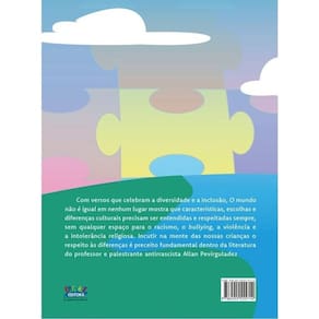 Com versos que celebram a diversidade e a inclusão, O Mundo Não É Igual Em Nenhum Lugar mostra que características, escolhas e diferenças culturais precisam ser entendidas e respeitadas sempre, sem qualquer espaço para o preconceito racial, o bullying e a violência e a intolerância religiosa.Incutir na mente das nossas crianças o respeito às diferenças é preceito fundamental dentro da literatura do professor Allan Pevirguladez.O objetivo final das suas letras é construir um mundo mais saudável, inclusivo e com equidade. Marca: Não Informado