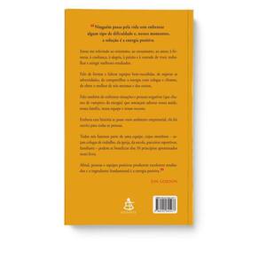 Mais de 2 milhões de livros vendidos. “Propósito, visão, entusiasmo e consciência são elementos cruciais para o sucesso individual e coletivo. Jon Gordon entrelaça esses princípios em um livro dinâmico e agradável que vai abastecer sua equipe – e você mesmo – de energia positiva.” – Pat Williams, vice-presidente do Orlando Magic “Ninguém passa pela vida sem enfrentar algum tipo de dificuldade e, nesses momentos, a solução é a energia positiva. Estou me referindo ao otimismo, ao entusiasmo, ao amor, à firmeza, à confiança, à alegria, à paixão e à vontade de viver, trabalhar e atingir melhores resultados. Falo de formar e liderar equipes bem-sucedidas, de superar as adversidades, de compartilhar a energia com colegas e clientes, de obter o melhor de nós mesmos e dos outros. Falo também de enfrentar situações e pessoas negativas (que chamo de vampiros da energia) que ameaçam sabotar nossa saúde, nossa família, nossa equipe e nosso sucesso. Embora esta história se passe num ambiente empresarial, ela foi escrita para todas as pessoas. Todos nós fazemos parte de uma equipe, cujos membros – sejam nossos colegas de trabalho, esporte, família, igreja ou escola – podem se beneficiar dos 10 princípios apresentados neste livro. Afinal, pessoas e equipes positivas produzem excelentes resultados e o ingrediente fundamental é a energia positiva.” – Jon Gordon