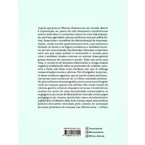 Aquilo que para os liberais clássicos era um mundo aberto à exploração, ao ponto de não desejarem interferências entre o indivíduo e o universo, tornou-se uma vida planejada, prevista, agendada, não por políticos, mas por publicitários, financistas e conselhos de administração de empresas. Assim, nesse mundo aparentemente livre, mas realmente fechado no limite e na lógica econômica, a realidade termina por ser uma extensão das fantasias, fantasias comerciais, uma vez que essas podem ir revestindo o mundo para criar e satisfazer desejos comuns no interior dessa grande granja humana de consumo e prazer. Tudo isso seria uma festa, o comércio de fantasias substituindo a antiga relação orgânica estabelecida sobre as pretensões de verdade, natureza e Deus, não fosse certa moldura com que se subjuga nossas relações morais e afetivas. Um divulgador importante dessa moldura cognitiva, que se usa de nossos sentimentos morais para constituir-se, é o filme animado produzido pela indústria cinematográfica norte-americana dirigido tanto às crianças quanto aos adultos. Em nosso tempo de intensa guerra cultural, enquanto se acusa e monitora as escolas em nome de uma normalidade conservadora, se negligencia em nome da liberdade de mercado o forte papel pedagógico do cinema produzido como entretenimento publicitário. O objetivo deste livro é tentar expor essa moldura político-discursiva veiculada pelo cinema de animação da maior produtora de sucessos nos últimos anos – a Pixar