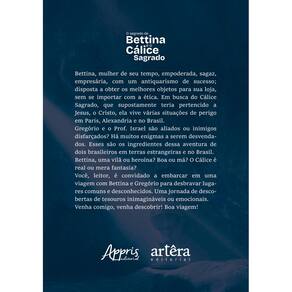 Bettina, mulher de seu tempo, empoderada, sagaz, empresária, com um antiquarismo de sucesso; disposta a obter os melhores objetos para sua loja, sem se importar com a ética. Em busca do Cálice Sagrado, que supostamente teria pertencido a Jesus, o Cristo, ela vive várias situações de perigo em Paris, Alexandria e no Brasil. Gregório e o Prof. Israel são aliados ou inimigos disfarçados? Há muitos enigmas a serem desvendados. Esses são os ingredientes dessa aventura de dois brasileiros em terras estrangeiras e no Brasil. Bettina, uma vilã ou heroína? Boa ou má? O Cálice é real ou mera fantasia? Você, leitor, é convidado a embarcar em uma viagem com Bettina e Gregório para desbravar lugares comuns e desconhecidos. Uma jornada de descobertas de tesouros inimagináveis ou emocionais. Venha comigo, venha descobrir! Boa viagem!