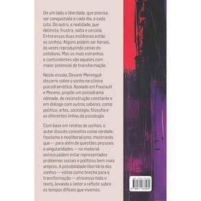 De um lado a liberdade, que precisa ser conquistada a cada dia, a cada luta. Do outro, a realidade, que delimita, frustra, solta e cerceia. Entre essas duas instâncias estão os sonhos. Alguns podem ser banais, às vezes reproduzindo cenas do cotidiano. Mas os mais estranhos e contundentes são aqueles com maior potencial de transformação. Neste ensaio, Devanir Merengué discorre sobre o sonho na clínica psicodramática. Apoiado em Foucault e Moreno, propõe um psicodrama nômade, de reconstrução constante e em diálogo com outros saberes, como política, artes, sociologia, filosofia e as diferentes linhas da psicologia. Com base em relatos de sonhos, o autor discute conceitos como verdade, fascismo e neoliberalismo, mostrando que — para além de questões pessoais e singularidades — no material onírico podem estar representados problemas sociais e políticos bem mais amplos. A possibilidade libertária dos sonhos — vistos como brecha para a transformação — atravessa todo o texto, levando o leitor a refletir sobre os tempos difíceis que vivemos.