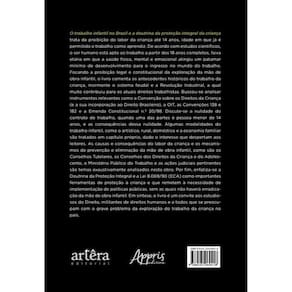 O trabalho infantil no Brasil e a doutrina da proteção integral da criança trata da proibição do labor da criança até 14 anos, idade em que já é permitido o trabalho como aprendiz. De acordo com estudos científicos, o ser humano está apto ao trabalho a partir dos 18 anos completos, faixa etária em que a saúde física, mental e emocional atingiu um patamar mínimo de desenvolvimento para o ingresso no mundo do trabalho. Focando a proibição legal e constitucional da exploração da mão de obra infantil, o livro comenta os antecedentes históricos do trabalho da criança, mormente o sistema feudal e a Revolução Industrial, a qual muito contribuiu para os atuais direitos trabalhistas. Buscou-se analisar instrumentos relevantes como a Convenção sobre os Direitos da Criança (e a sua incorporação ao Direito Brasileiro), a OIT, as Convenções 138 e 182 e a Emenda Constitucional n.º 20/98. Discute-se a nulidade do contrato de trabalho, quando uma das partes é pessoa menor de 14 anos, e as consequências dessa nulidade. Algumas modalidades do trabalho infantil, como o artístico, rural, doméstico e a economia familiar são tratados em capítulo próprio, dado o interesse que despertam aos leitores. As causas e consequências do labor da criança e os mecanismos de prevenção e eliminação da mão de obra infantil, como são os Conselhos Tutelares, os Conselhos dos Direitos da Criança e do Adolescente, o Ministério Público do Trabalho e as ações judiciais pertinentes são temas exaustivamente analisados nesta obra. Por fim, enfatiza-se a Doutrina da Proteção Integral e a Lei 8.069/90 (ECA) como importantes ferramentas de proteção à criança e que remetem à necessidade de implementação de políticas públicas, sem as quais não haverá erradicação da mão de obra infantil. Em síntese, o livro é um convite aos estudiosos do Direito, militantes de direitos humanos e a todos que se preocupam com o grave problema da exploração do trabalho da criança no país. Marca: ARTERA EDITORA