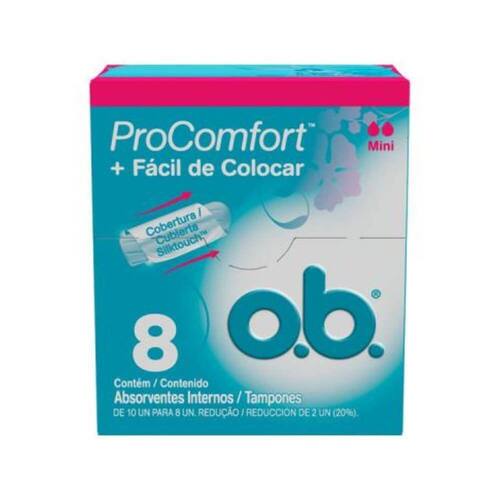 O.b Pro Comfort Mini Absorvente Interno C/8 DESCRIÇÃO: O Absorvente Interno OB Pro Comfort é fácil de usar pois tem formato mais estreito com a ponta mais fina e se expande lateralmente. Adaptando-se ao contorno do seu corpo, evitando vazamentos e oferecendo máxima proteção. AÇÃO/ATIVOS: Combina com a tecnologia dos canais curvos que absorvem o fluxo para uma proteção segura. Com a exclusiva cobertura (sem sugestões) que desliza melhor para uma colocação mais fácilMODO DE USAR: Veja guia explicativo no interior da embalagem.ESTE ANÚNCIO CONTÉM: 01 Unidade de O.B Pro Comfort Mini Absorvente Interno C/8O.B Pro Comfort Mini Absorvente Interno C/8