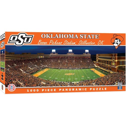 MasterPieces - Quebra-cabeça de 1000 peças, NCAA Oklahoma State Cowboys, vista panorâmica do estádio de futebol, diversão para adultos e família, 33 cm x 99 cm - Licenciado oficialmente: nossos quebra-cabeças panorâmicos NCAA são oficialmente licenciados pelas ligas em que seus times favoritos jogam; divertidos para dias de jogos e não autorização; Masterpieces é uma empresa americana de quebra-cabeças e jogos - FORMAS ÚNICAS: O quebra-cabeça possui 1.000 peças em uma variedade de cortes, garantindo um desafio; peças grossas interligadas seguram firmemente; acabamento fosco antirreflexo reduz o cansaço visual - Responsável pelo meio ambiente: nossos quebra-cabeças são feitos de material 100% reciclado e tintas à base de soja não tóxicas - Desafio: Nossos quebra-cabeças são projetados para serem divertidos e mentalmente estimulantes; ajudam no relaxamento; aumentam as habilidades de resolução de problemas; ótima atividade social com a família e amigos - Entretenimento para todos: a coleção MasterPieces oferece a maneira perfeita de manter a diversão noturna do jogo; selecione entre quebra-cabeças para adultos, idosos e crianças; baralhos exclusivos de baralho, jogos de tabuleiro, dominó, kits de artesanato e muito mais