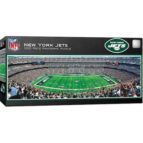 Masterpieces Quebra-cabeça esportivo de 1000 peças - NFL New York Jets vista panorâmica central - 33 cm x 99 cm - Dr. Toy Award of Excellence - 100 melhores brinquedos - Produto oficialmente licenciado pela NFL - 1000 peças em quebra-cabeça acabado de 33 cm por 99 cm. Adequado para emoldurar quando montado - O tabuleiro de quebra-cabeça espesso reciclado e as peças de corte aleatório garantem um ajuste justo e criam uma experiência divertida