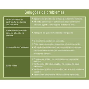 - Chip inteligente, desliga a bomba no caso de falta de água ou obstrução;