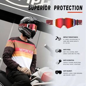 IMPORTANTE: Se for um produto elétrico, ele pode ser compatível com uma tomada de 110 volts. Se utilizado fora dos Estados Unidos, pode ser necessário um conversor de voltagem para garantir a operação adequada. Verifique se o produto que você está comprando é elétrico antes de considerar essas informações. Procurando óculos para bicicletas sujas que possam acompanhar seu estilo de vida ativo em vários esportes? Os óculos de motocross VOZAPOW são projetados especificamente para pilotos. Eles não apenas incorporam elementos de moda, mas também se concentram em melhorar a praticidade e o conforto . -?Equipe-se para uma aventura off-road?A melhor viagem começa com o melhor equipamento. Os óculos de bicicleta suja VOZAPOW são construídos para conquistar o ar livre. Com seu design arrojado, lentes resistentes à prova de estilhaçamento e design de bloqueio magnético, o VOZAPOW garante que você não apenas tenha uma aparência elegante, mas também permaneça totalmente protegida e ágil. Prepare-se para qualquer aventura que se atreva a cruzar seu caminho. -?Design inovador de fechadura magnética?Durante sua aventura, cada detalhe pode afetar sua experiência e segurança. A VOZAPOW entende isso com a tecnologia de bloqueio magnético que não apenas mantém a característica de substituição rápida das lentes, mas também garante a estabilidade dos óculos da motocicleta durante exercícios intensos, permitindo que você mantenha o foco e a determinação sem perder o ritmo. -?Lente REVO antiembaçante?A lente REVO de camada dupla minimiza o embaçamento e resiste à areia e ao cascalho em até 120 m/s, protegendo seus olhos dos raios UV mais fortes e dos impactos inesperados para oferecer uma visão HD. Com o design OTG (Over The Glasses), você pode usar seus óculos sob os óculos ATV. -?Conforto e estabilidade incomparáveis?O design de espuma de camada tripla se encaixa perfeitamente no rosto e oferece excelente amortecimento para conforto durante várias atividades esportivas, incluindo motocicletas, bicicletas sujas, MTB, equitação e snowboard. A alça elástica ajustável antiderrapante garante um ajuste perfeito para ciclistas de todos os tamanhos. -?Garantia vitalícia?A VOZAPOW se concentra na qualidade do produto e na satisfação do cliente. Se você tiver algum problema de qualidade ou insatisfação após receber o produto, sinta-se à vontade para entrar em contato conosco e resolveremos para você até que esteja satisfeito!