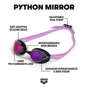 ARENA Óculos de natação unissex para adultos Python Racing para homens e mulheres, lentes espelhadas, conforto máximo, alça dupla, violeta/preto/violeta - Óculos espelhados confortáveis com um ajuste pequeno para nadadores competitivos, projetados para o máximo de conforto e hidrodinâmica avançada para que você possa ter o melhor desempenho - A lente leve elegante em forma de olho de cobra oferece o melhor desempenho hidrodinâmico enquanto oferece uma visão ampla e mais clara dos elementos competitivos - A lente espelhada reduz o brilho do sol enquanto nada ao ar livre e em piscinas bem iluminadas; também disponível em uma lente não espelhada para todas as suas necessidades de concorrência - A lente protetora de policarbonato endurecido oferece máxima durabilidade e clareza, enquanto o revestimento especial elimina o vapor, resultando em um efeito antiembaçamento para uma visão clara - Equipado com vedações de silicone adaptáveis macias e uma alça dupla ajustável para o máximo conforto e um ajuste estável, e entregue com três pontes de nariz intercambiáveis para personalização perfeita