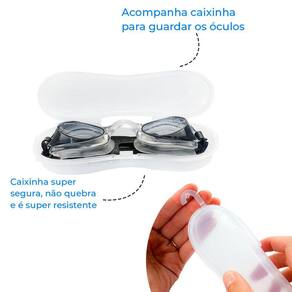 Proporcionando uma experiência segura e confortável para os pequenos nadadores, este conjunto, além de oferecer visibilidade nítida, acompanha tampões de ouvido para garantir proteção auditiva durante o nado e um estojo transparente para armazenar o óculos quando não estiver em uso, podendo carregá-lo para onde for.