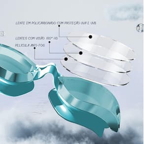 * 100% em Silicone de Ultima geração de alta qualidade. * É impermeável e anti-fog, perfeito para nadar. * Acessório muito necessário e útil para adultos para nadar. * Lentes de qualidade poli carbonato, 100% proteção UVA E UVB 400 com campo de visão 180° e high definicion.