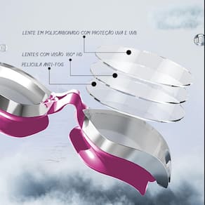 * 100% em Silicone de Ultima geração de alta qualidade. * É impermeável e anti-fog, perfeito para nadar. * Acessório muito necessário e útil para adultos para nadar. * Lentes de qualidade poli carbonato, 100% proteção UVA E UVB 400 com campo de visão 180° e high definicion.