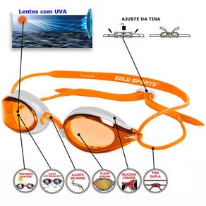 Óculos De Natação Gold Sports Tornado Clear Vision HD possui uma tecnologia na ventosa que oferece uma vedação perfeita sem deixar marcas. Ideal para competições e treinamentos. Lentes curvadas para ampla visão, tiras duplas e película antiembaçante e proteção UV suas lentes são confeccionadas em poli carbonato de ultima geração com tratamento Clear Vision que deixa com a cor laranja proporcionando uma claridade extrema e uma visão High Definition