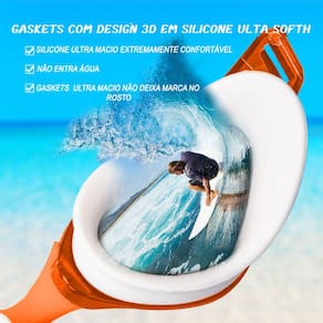 Ventosaem Silicone Ultra Soft; Lentes Curvadas ;Lentes com Proteção UV; Película Antiembaçante; Narigueira removível;Tira Dupla; Tecnologia das Lentes Clear Vison
