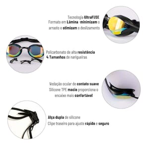 Óculos de Natação PRO VISION TRYDEA escolha perfeita para quem busca desempenho e conforto, seja em competições ou treinamentos. Com design de última geração, os PRO VISION TRYDE oferecem um ajuste ultraconfortável graças às suas juntas de precisão. Suas lentes espelhadas de baixo perfil, combinadas com a tecnologia UltraFUSE e o formato em lâmina, minimizam o arrasto e otimizam o deslizamento, criando um design elegante e totalmente à prova d'água. Com proteção UV, antiembaçante, lentes espelhados, ultrafit. O formato curvo das lentes amplia a visão periférica e frontal, proporcionando um campo de visão significativamente expandido. Fabricadas em policarbonato de alta resistência e revestidas com proteção antiembaçante, as lentes garantem visibilidade clara e segura debaixo d'água. Equipados com alça dupla de silicone, narigueiras intercambiáveis e um clipe traseiro, os PRO VISION proporcionam um ajuste personalizado e seguro. As fivelas laterais reforçam a resistência e durabilidade, conectando a alça ao quadro de forma eficaz. Mergulhe com confiança, sabendo que está usando óculos que combinam conforto, segurança e desempenho incomparáveis. Tecnologia UltraFUSEA tecnologia UltraFUSE torna o design mais elegante, aumenta o conforto, reduz a pressão ao redor dos olhos e previne vazamentos. Conforto TotalO TPE macio oferece o encaixe mais confortável possível. Ajuste PersonalizadoDisponível com quatro tamanhos de narigueiras intercambiáveis (XS, S, M, L) para garantir o melhor ajuste. Estabilidade MáximaA alça dupla de silicone proporciona fixação segura, ideal para competições de alta intensidade. Marca: Tryde