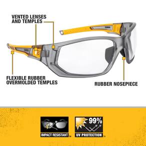 DEWALT Óculos de proteção unissex DPG112 com armação completa ventilada, lente transparente - Design totalmente livre: os óculos de proteção DEWALT Miter apresentam um design robusto de armação completa que oferece cobertura completa e proteção superior para seus olhos em qualquer ambiente de trabalho. - Templos flexíveis: equipados com hastes flexíveis sobremoldadas de borracha, esses óculos de segurança garantem um ajuste seguro e confortável, mesmo durante uso prolongado. - Lentes e templos ventilados: lentes e hastes ventiladas promovem o fluxo de ar, reduzindo o embaçamento e mantendo a visão clara, especialmente em ambientes de trabalho dinâmicos. - Peça de nariz de borracha: o nariz de borracha evita o deslizamento, garantindo que os óculos permaneçam no lugar, não importa o quão ativo seja seu dia de trabalho. - Ponto de fixação do cordão do pescoço: projetados com a conveniência em mente, esses óculos de proteção apresentam um ponto de fixação para um cordão de pescoço (não incluído), permitindo que você os mantenha seguros e ao alcance quando não estiverem em uso. - Proteção UV: com 99,9% de proteção UV, os óculos de proteção DEWALT Miter protegem seus olhos dos raios ultravioleta prejudiciais, tornando-os ideais para tarefas ao ar livre. - Classificação de impacto: estes óculos de segurança atendem aos padrões de alto impacto do Z87+, garantindo proteção robusta contra detritos voadores e outros perigos.