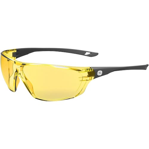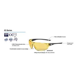 Óculos de segurança GE com lente âmbar antiembaçante/anti-arranhões que tem uma proteção UV de 99,9%. Com uma confortável ponte nasal moldada e pontas flexíveis nas têmporas com orifícios para o cordão do pescoço.